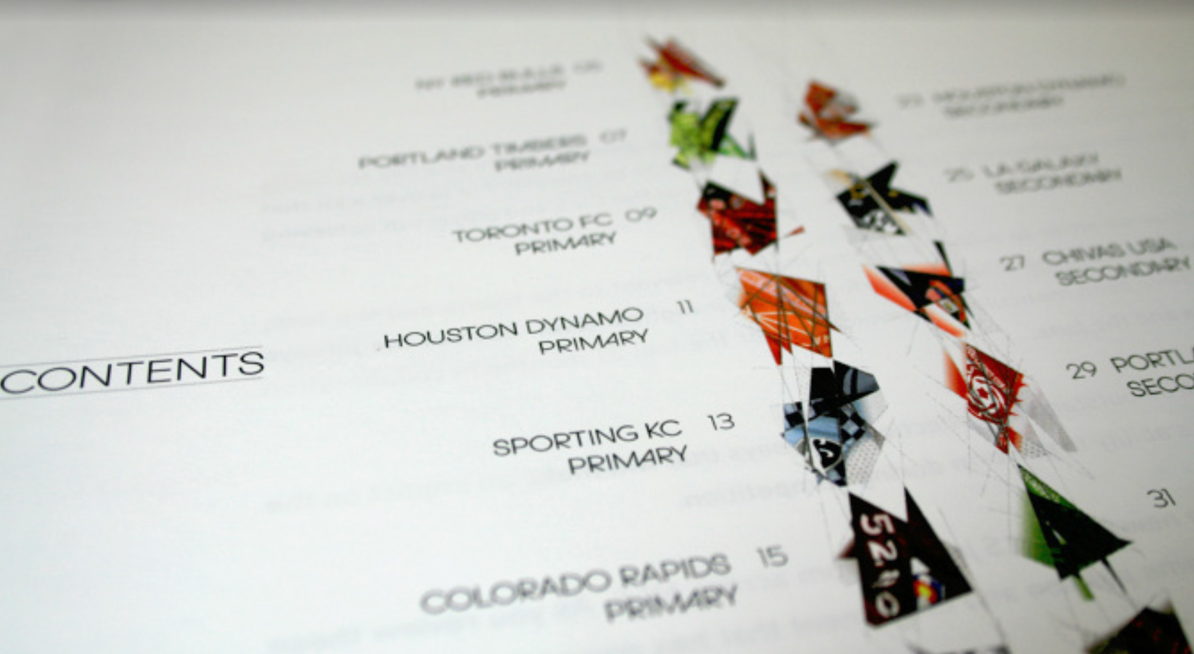 This book uses clips of detail photography of the jerseys combined in artistic compositions. When aligned side by side, the compositions piece together seAmlessly as shown in the wayfinding graphic toward the footer of the PAGES.